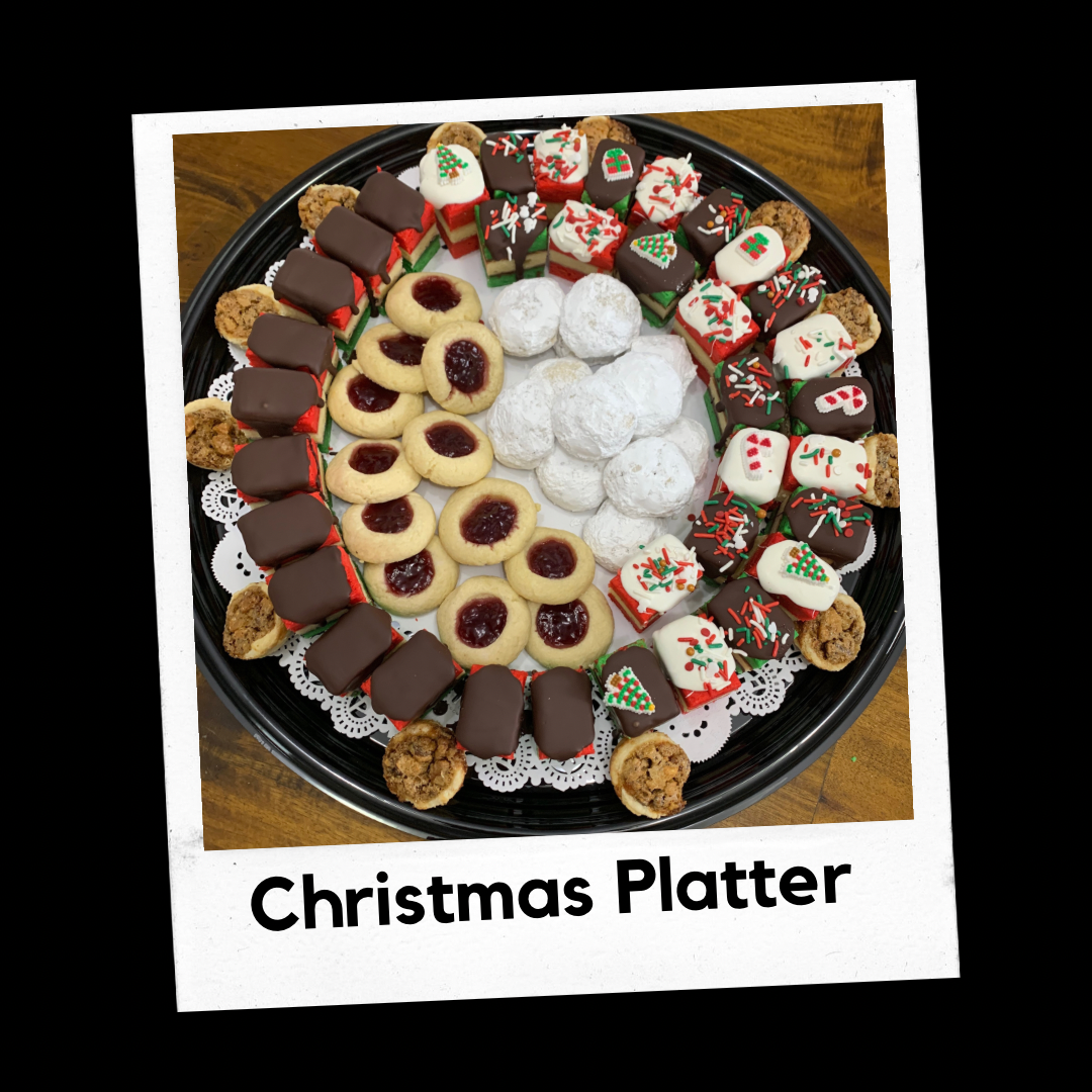 Small Platter includes 6 Each Traditional Rainbow Cookies, Nutella Rainbow Cookies, Apricot Rainbow Cookies, Walnut Tassies, Butterballs, and Raspberry Thumbprint Cookies